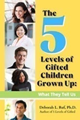 The 5 Levels of Gifted Children Grown Up: What They Tell Us (2023). This is a 20-year longitudinal study follow-up about the original gifted child subjects in 5 Levels of Gifted: School Issues and Educational Options (2005, 2009). In it, Dr. Ruf covers every conceivable topic to ask the 60 of the original study group of 78. She also shows readers how it is that people of the same original promise to succeed have vastly different outcomes. https://www.amazon.com/Levels-Gifted-Children-Grown-Up/dp/B0C9SHFRLH or https://www.barnesandnoble.com/w/the-5-levels-of-gifted-children-grown-up-phd-deborah-l-ruf/1143719859?ean=9798988323709.