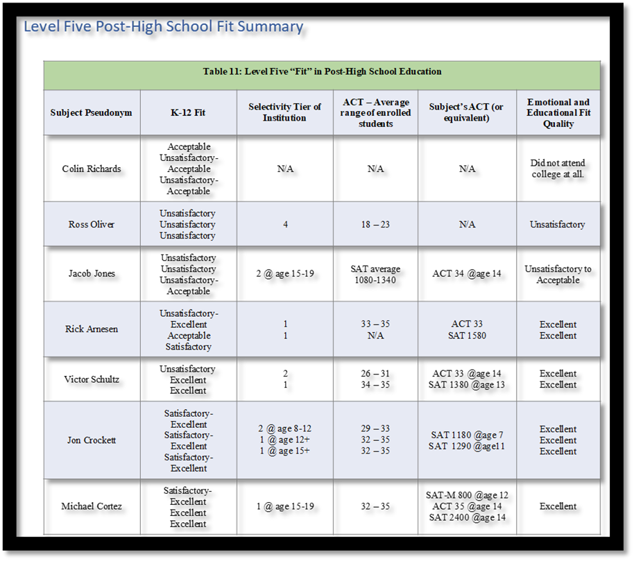 A quick look at the Level Five table shows us that, even within this small group, every kind of outcome is represented. One did not go to post-secondary at all; one had an Unsatisfactory fit and experience; another had a mediocre experience in contrast to his amazing ability level; and four had Excellent fits but, as this section reveals, notably different experiences in the ages when they experienced higher-level education and in their career paths. Although some of the Level Three and Four subjects took college entrance exams earlier than the typical ages of 16 and 17 (junior and senior years of high school), it was not noted in those tables unless no junior and senior year scores were available. And the same circumstances of grade-skipping were present in earlier Levels sections and not always mentioned except in the narrative, but it is so common in the Level Five group that it is presented within the table because it correlates with the Excellent label’s use for a Tier 2 institution when the student is still a preteen. Finally, many of the following descriptions are kept deliberately vague so as to honor the promise of anonymity to the subjects.