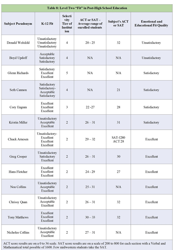 In this series of post-secondary results and fit, I add slightly expanded tables that include summary results of what each young person experienced (Unsatisfactory, Acceptable, Satisfactory, and Excellent) during their kindergarten through high school years. I’ve added categories to the Levels’ tables connected to their post-secondary environments and choices. The intention is to illustrate that a poor school fit can have repercussions well beyond one’s grade school years because it continues to affect the self-concept, goals, ability to compete or keep up, and a sense of belonging — fitting in — of the individuals.